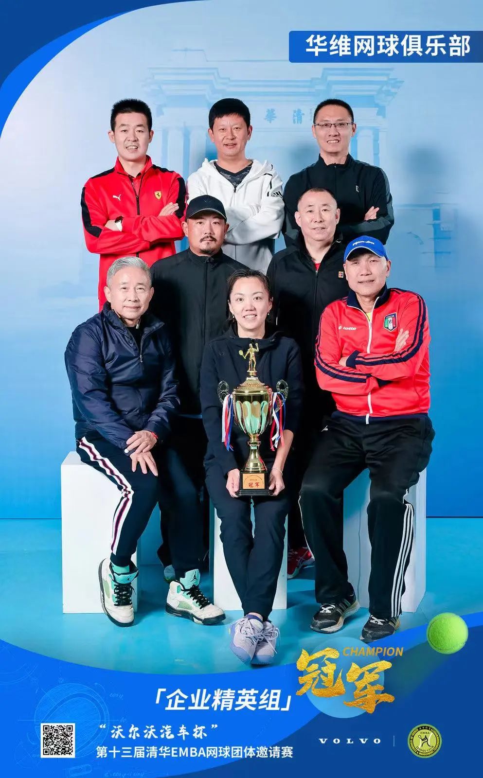 感谢沃尔沃汽车、水井坊、安踏体育和施莱辛格的合作支持, 感谢主办方清华经管EMBA网球协会和承办方乾坤体育的细心组织, 清华经管EMBA网球团体邀请赛, 我们明年见!