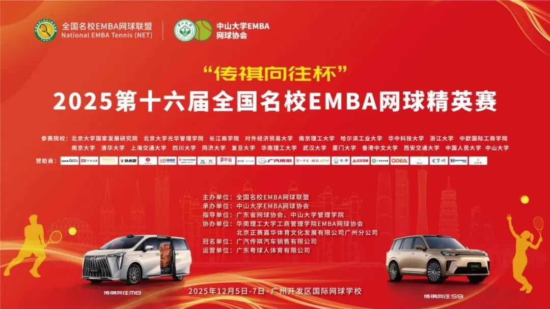 精英对决,湾区启航!由传祺向往独家冠名的 “传祺向往杯” 2025 第十六届全国名校 EMBA 网球精英赛,首次重磅落地粤港澳大湾区!这场精英体育盛宴,既有焕新升级的专业赛场护航,更有高端酒店全程赋能,让竞技激情与惬意休憩完美相融。 ![]() 作为国内商学院体育标杆赛事,全国名校 EMBA 网球精英赛已成功举办十五届,始终聚焦 EMBA 群体的体育精神与圈层交流,影响力覆盖全国顶尖商学院。今年赛事首度落子大湾区,由中山大学 EMBA 网球协会承办,汇聚 24 所名校的 32 支精英战队,将于 2025 年 12 月 5 日 - 7 日在广州开发区国际网球学校开赛,300 多场巅峰对决即将燃动湾区。 01专业赛场焕新,筑牢赛事根基 今年,作为广州黄埔国际网球公开赛的举办场地,广州开发区国际网球学校已完成全方位升级改造,改造围绕场地硬件,以赛前焕新的姿态迎接高端赛事检阅,确保场馆标准完全契合国际赛事要求,也为全国名校EMBA网球精英赛的举办提供更优质的基础条件。 精英对决,湾区启航!由传祺向往独家冠名的 “传祺向往杯” 2025 第十六届全国名校 EMBA 网球精英赛,首次重磅落地粤港澳大湾区!这场精英体育盛宴,既有焕新升级的专业赛场护航,更有高端酒店全程赋能,让竞技激情与惬意休憩完美相融。 作为国内商学院体育标杆赛事,全国名校 EMBA 网球精英赛已成功举办十五届,始终聚焦 EMBA 群体的体育精神与圈层交流,影响力覆盖全国顶尖商学院。今年赛事首度落子大湾区,由中山大学 EMBA 网球协会承办,汇聚 24 所名校的 32 支精英战队,将于 2025 年 12 月 5 日 - 7 日在广州开发区国际网球学校开赛,300 多场巅峰对决即将燃动湾区。