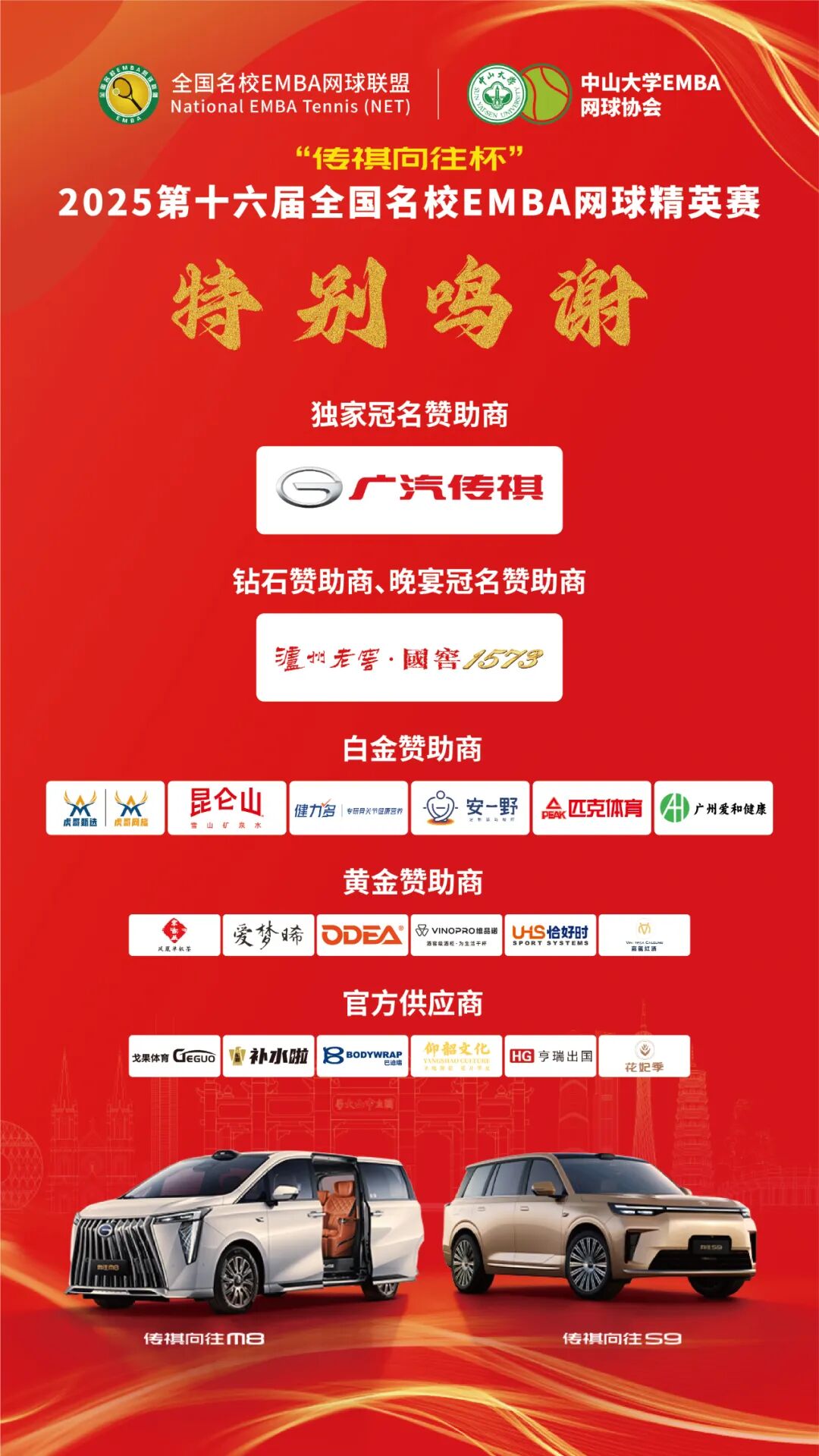 交通指引:广州翡翠希尔顿酒店-广州开发区国际网球学校步行路线示意 本届赛事由全国名校 EMBA网球联盟主办,中山大学 EMBA网球协会承办,广东省网球协会、中山大学管理学院指导,广东粤球人体育有限公司运营,华南理工大学工商管理学院EMBA网球协会、北京正赛嘉华体育文化发展有限广州分公司协办,广汽传祺汽车销售有限公司冠名赞助。 特别鸣谢广汽传祺汽车销售有限公司独家冠名赞助本届赛事,感谢泸州老窖·国窖1573对赛事的大力支持,此外感谢安一野、汤臣倍健健力多、匹克体育、昆仑山矿泉水、广州爱和健康、虎哥甄选&虎哥网旅、欧帝尔网球、维品诺恒温酒柜、恰好时体育、爱梦晞、嘉龙红酒、潮州宋古丛茶庄、巴迪瑞、东鹏补水啦、仰韶科技、亨瑞出国、戈果体育、花妃季、网球记、全网球等知名企业和单位对赛事的赞助支持,为赛事提供全方位的服务和保障。 12 月 5 日 - 7 日,让我们期待这场跨越十六载的赛事,以大湾区新姿态书写高端商学院网球新篇章;更盼全国 EMBA 精英与嘉宾,在赛场上以精准挥拍诠释竞技魅力,用精彩对决传递坚韧体育精神,于输赢之外收获成长与友谊,让网球活力与精英风采在湾区热土尽情绽放。