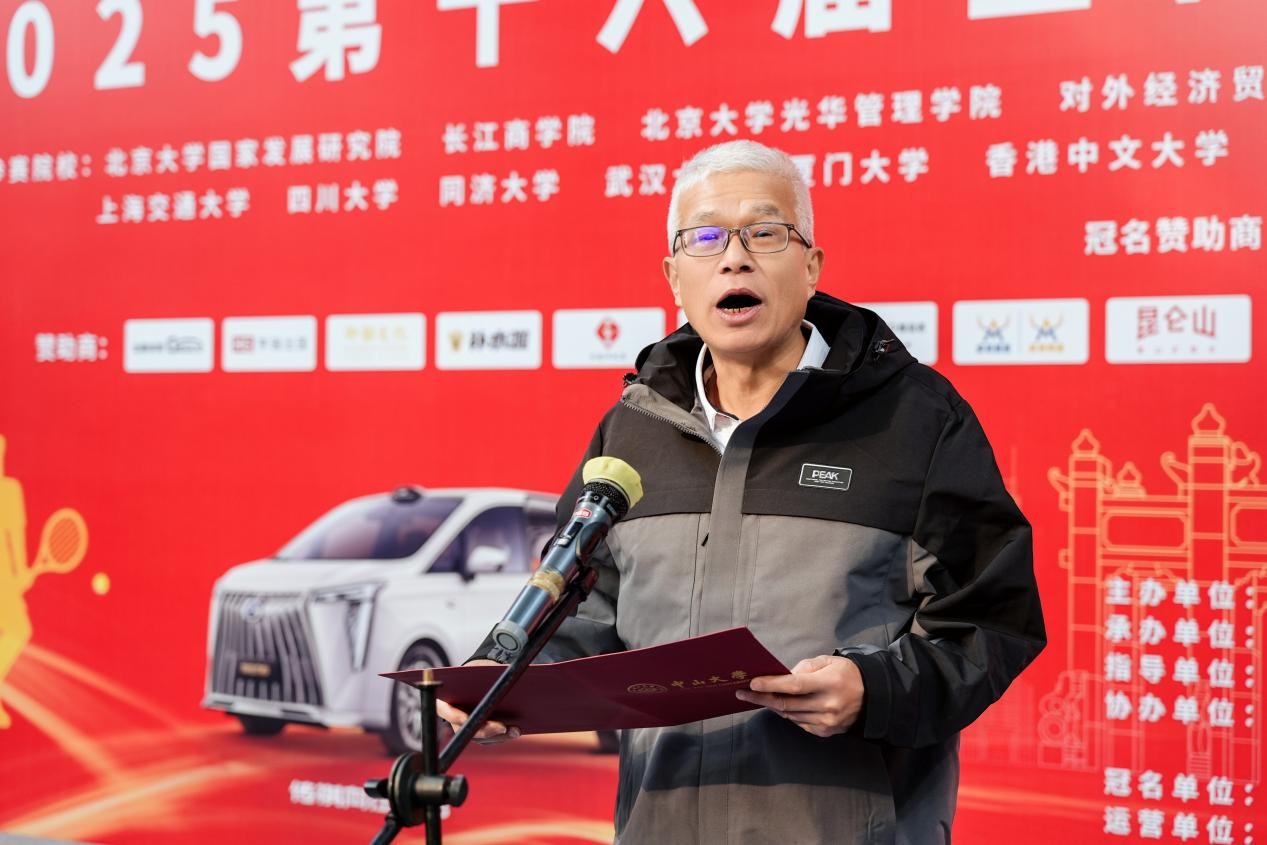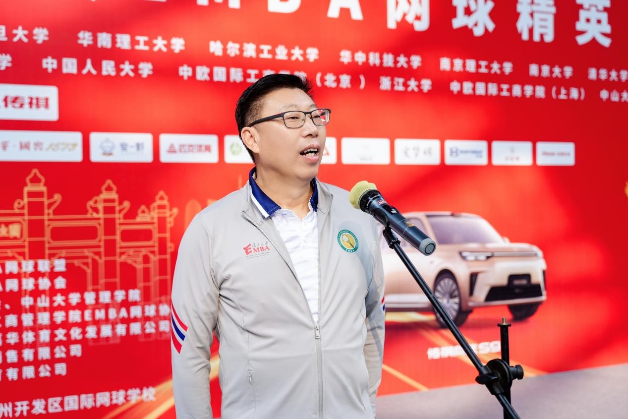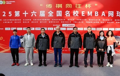 中国网球协会主席刘文斌,广东省网球协会主席麦良,全国名校EMBA网球联盟秘书长、复旦大学 EMBA 网球协会会长殷涛,中山大学副校长杨东华教授,第十六届赛事组委会主席、中山大学 EMBA 网球协会会长曾毓昌,中山大学校友会秘书长黄瑞敏,中山大学体育部党委书记凌春贤,华南理工大学工商管理学院党委书记周勤等携手完成开球仪式。