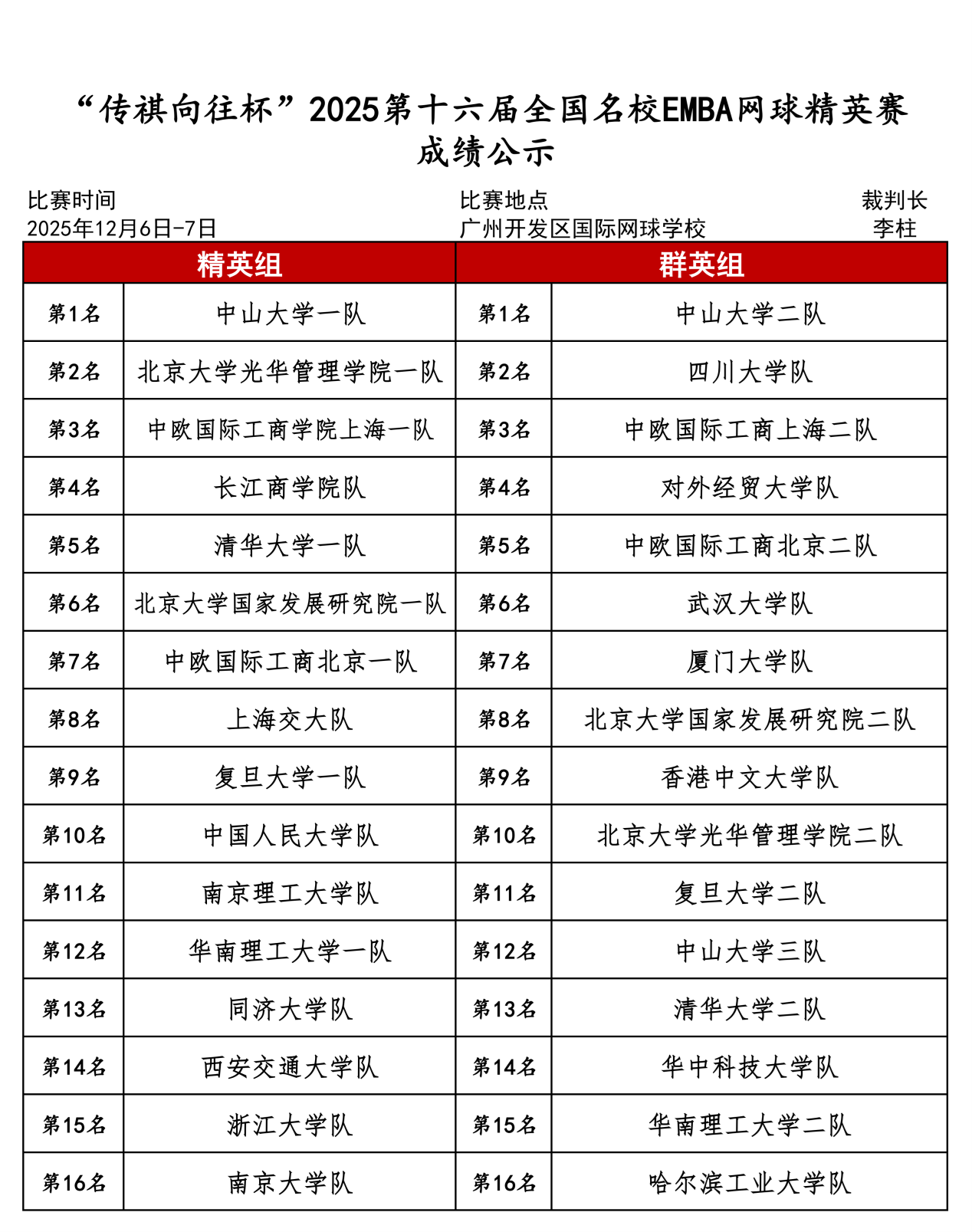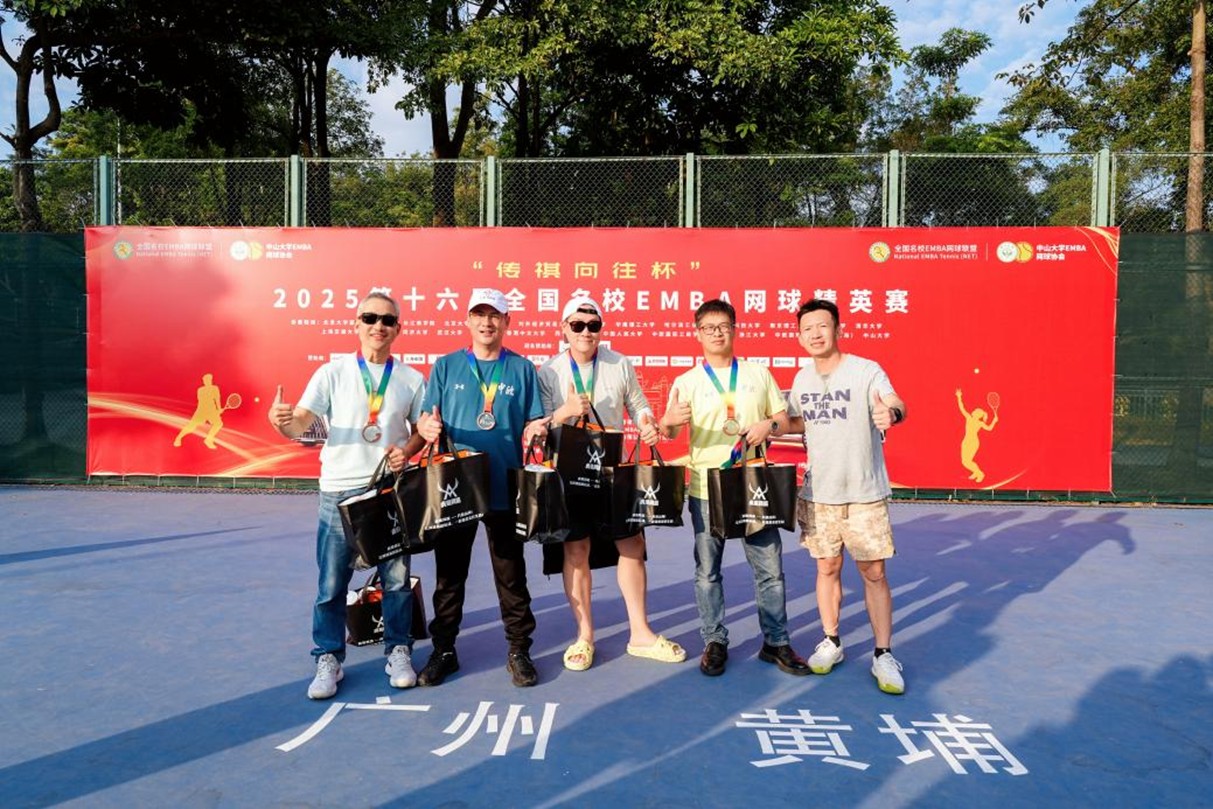 精英组决赛堪称焦点之战,中山大学一队从小组赛到决赛全程鏖战,8进4、4进2及冠军争夺战均通过抢七大战艰难胜出,与北京大学光华管理学院一队的巅峰对决更是一分险胜锁定胜局,刁钻发球、网前截击、底线相持等精彩瞬间轮番上演。最终,北京大学光华管理学院一队获精英组亚军,中欧国际工商学院上海一队摘得季军;四川大学队获群英组亚军,中欧国际工商学院上海二队拿下季军。