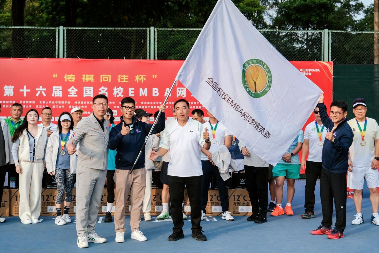 颁奖后,备受瞩目的会旗交接仪式顺利举行。第十六届赛事组委会主席曾毓昌首先将会旗郑重交予全国名校EMBA网球联盟秘书长殷涛,随后转交给2026年赛事承办单位香港中文大学代表。旗帜的交接既是本届赛事圆满落幕的标志,更是赛事精神的延续与传承,预示着这场高端精英赛事将在新一年绽放更耀眼的光彩。