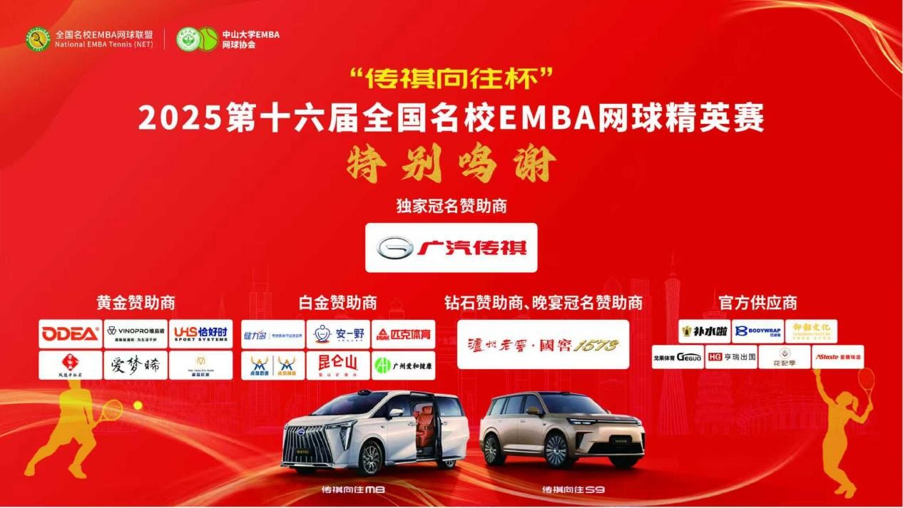 由传祺向往独家冠名赞助的“传祺向往杯” 2025第十六届全国名校EMBA网球精英赛,于 12 月 7 日在广州开发区国际网球学校圆满落幕。本届赛事由全国名校 EMBA网球联盟主办,中山大学EMBA网球协会承办,广东省网球协会、中山大学管理学院指导,广东粤球人体育有限公司运营,华南理工大学工商管理学院EMBA网球协会、北京正赛嘉华体育文化发展有限广州分公司协办。